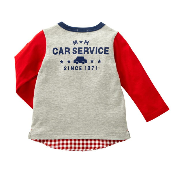 身頃の裾からチェックのシャツがのぞいた重ね着風のデザインは 1枚で可愛く着られるようになっています。